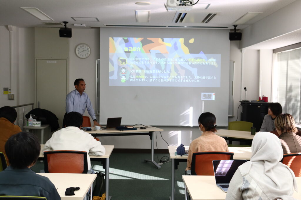 シギト氏の講演には、学生や留学生ら約15人が参加し、シギト氏の熱い語りに聴き入っていました。また、その後の交流会では、参加した学生から「貧困地域で日本語教育のボランティア活動を行う動機はなんですか?」「愛媛大学在学中のどんな思い出が印象に残っていますか?」といった質問があり、多くの質疑応答が交わされました。